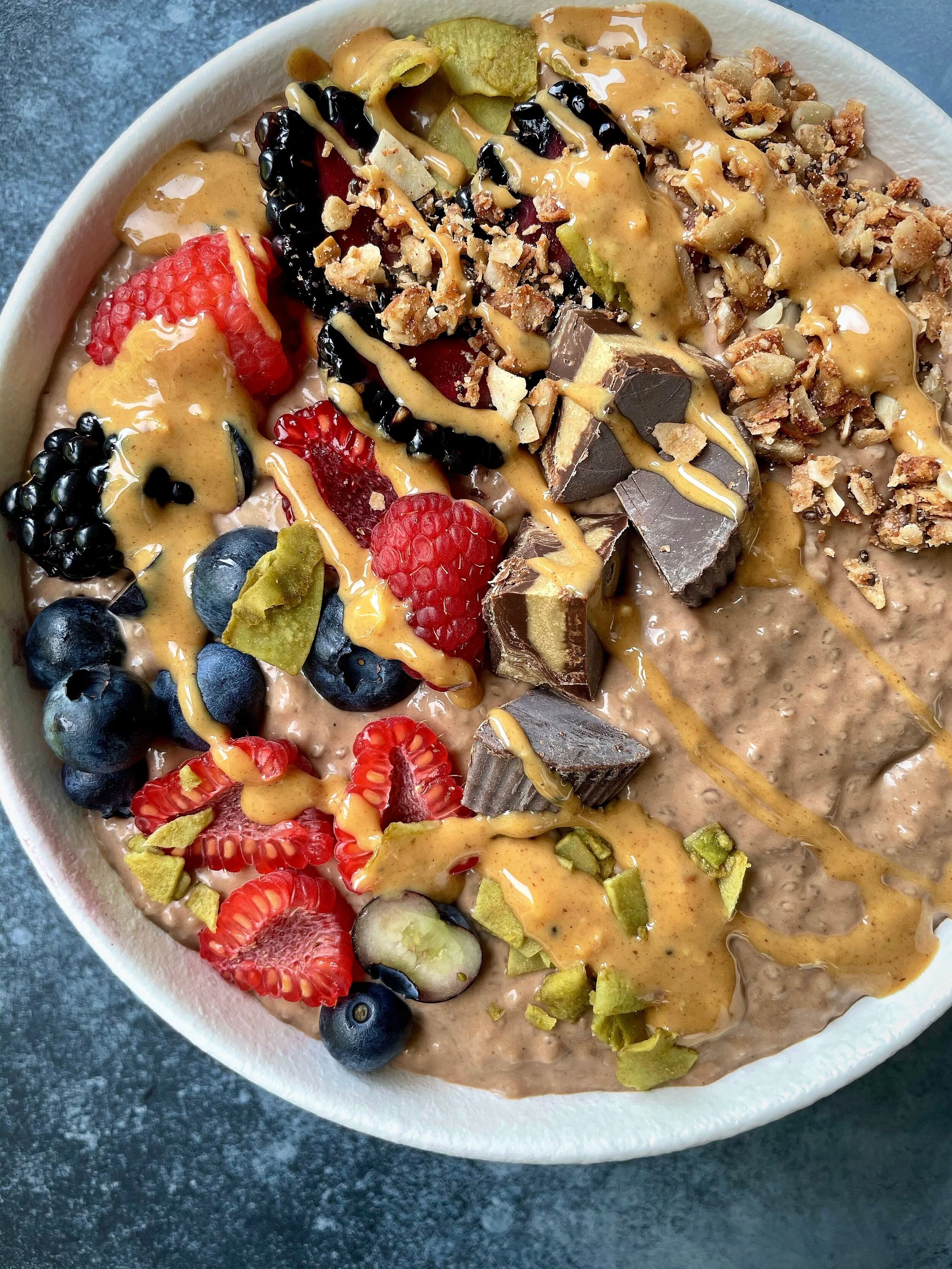 Chocolate Peanut Butter Cup Pudding topped with berries, sugar-free granola, Rawcology matcha coconut chips, and Fatso Salted Caramel peanut butter.