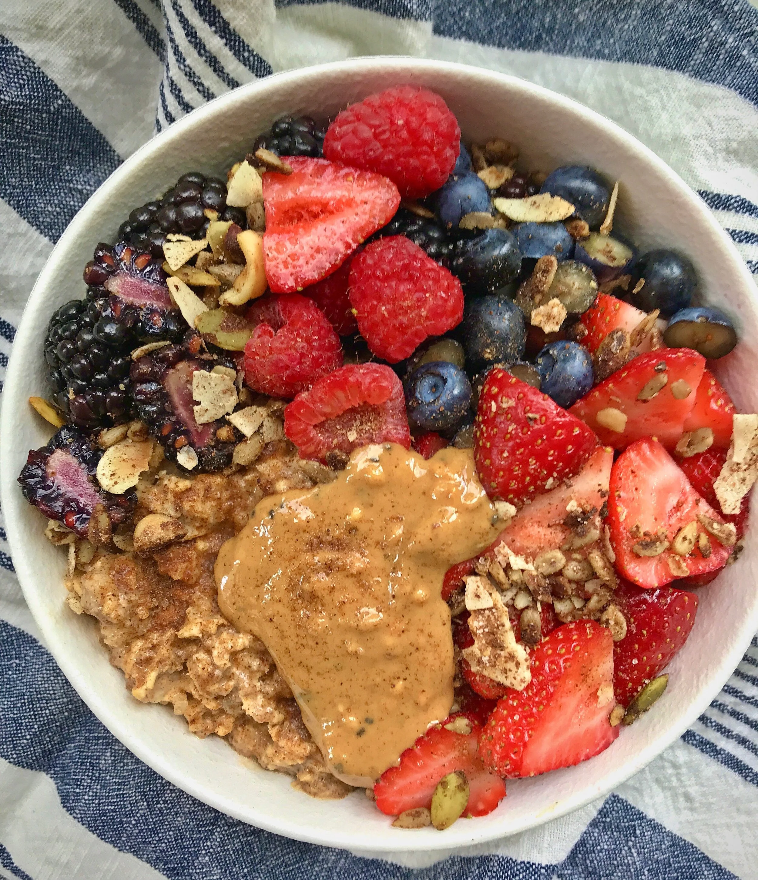 /Snickerdoodle Overnight Cauliflower Oats topped with berries, grapes, kiwi, Giddy Yo cacao nibs, and grain-free granola.